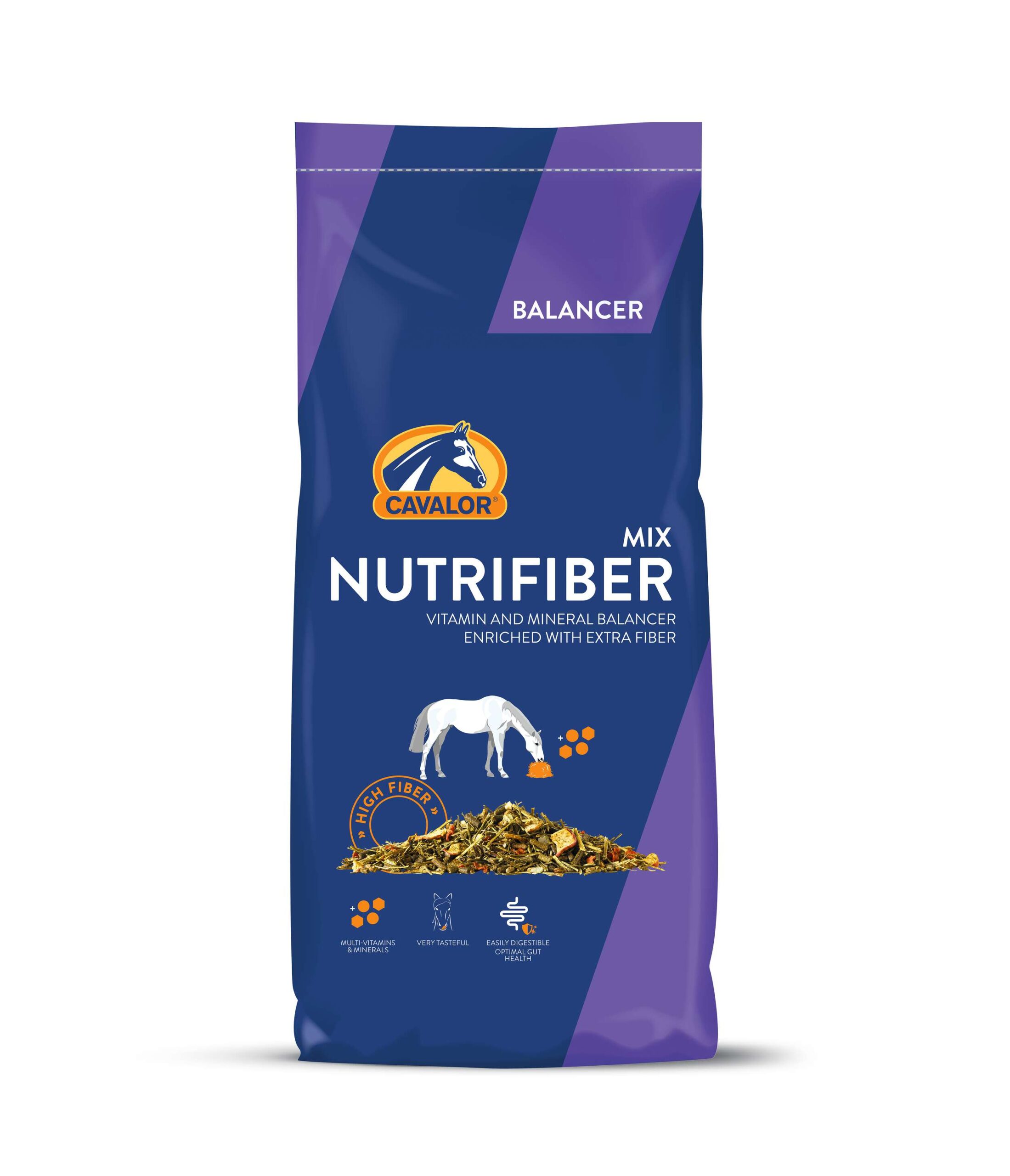 Cavalor Nutri Fiber är en välsmakande fiberrik balancer med en komplett blandning av vitaminer och mineraler, vilket gör den till ett oumbärligt tillskott till grovfoder. Den är speciellt utvecklad för hästar som utfodras med grovfoder och lite eller inga kraftfoder. Cavalor Nutri Fiber innehåller essentiella fibrer, vitaminer och mineraler samt bitar av morot och äpple. Även de kräsnaste hästarna älskar den. Cavalor Nutri Fiber är en utsökt, hälsosam blandning som inte överbelastar din häst med kalorier och energi. Grovfoder är huvudingrediensen i en hästs diet. Det gäller alla hästar. En hästs behov av kraftfoder beror på dess arbetsbelastning. Hästar i underhåll eller med lätt arbete får ofta tillräckligt med energi och protein från högkvalitativt grovfoder och behöver inte extra kraftfoder. De behöver dock en balancer, eftersom grovfoder inte täcker deras totala vitamin- och mineralbehov. Cavalor Nutri Fiber är en balancer. Nutri Fiber har alla vitaminer och mineraler som en häst behöver, vilket gör den till ett viktigt tillskott till foderstater som innehåller lite eller inga kraftfoder.