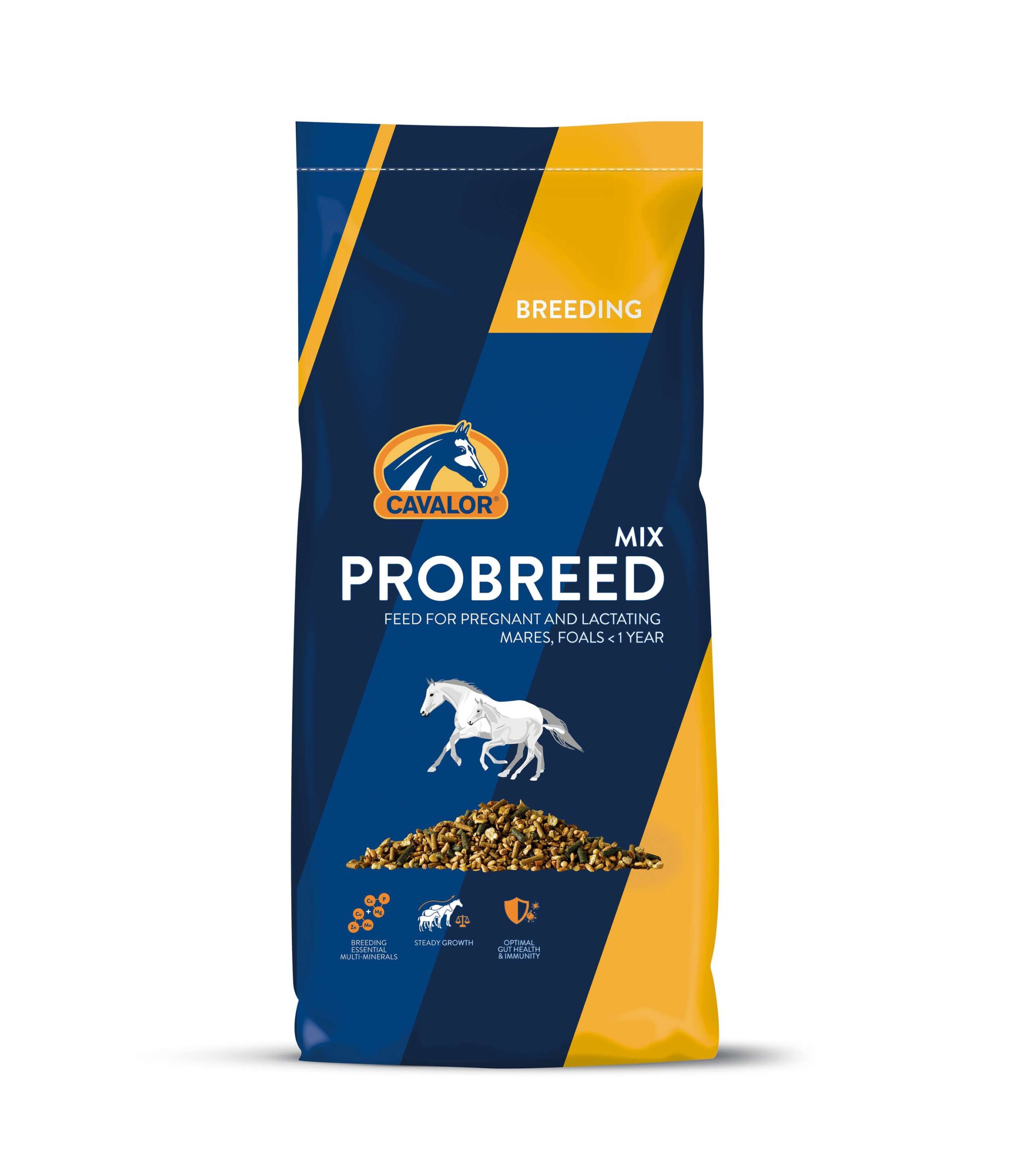 Cavalor Probreed Mix är en musli för dräktiga och digivande ston samt föl under ett år. Denna blandning stödjer god utveckling och balanserad tillväxt hos föl och håller ston i gott skick. Med puffade spannmål för god absorption och lätt matsmältning. Innehåller pre- och probiotika för utvecklingen av en hälsosam tarmflora, vilket ger grunden för naturligt motstånd. Rätt kalcium/fosfor/magnesium-förhållande säkerställer god benutveckling och densitet. Den ideala kombinationen av organisk koppar, zink och mangan säkerställer god utveckling av ben, leder och senor.