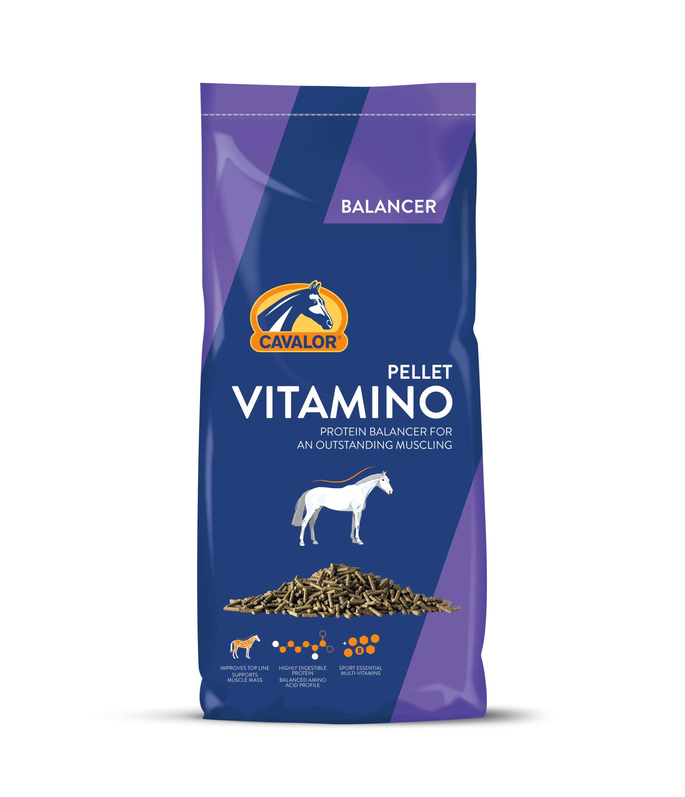 Cavalor VitAmino är en proteinbalancer för utmärkt muskulatur och överlinje. Denna balancer är en källa till högkvalitativa proteiner som är lättsmälta och har en specifik aminosyraprofil, vilket ger ett optimalt bidrag till att utveckla mer muskelmassa. För att bygga muskler behöver hästar tillräckligt med näringsämnen, och det inkluderar specifika aminosyror. Cavalor VitAmino innehåller soja-, alfalfa- och potatisprotein som innehåller alla essentiella aminosyror i rätt proportioner, för maximal effektivitet i att utveckla starka muskler. Innehåller vitaminer, spårämnen och mineraler för en näringsmässigt balanserad diet.